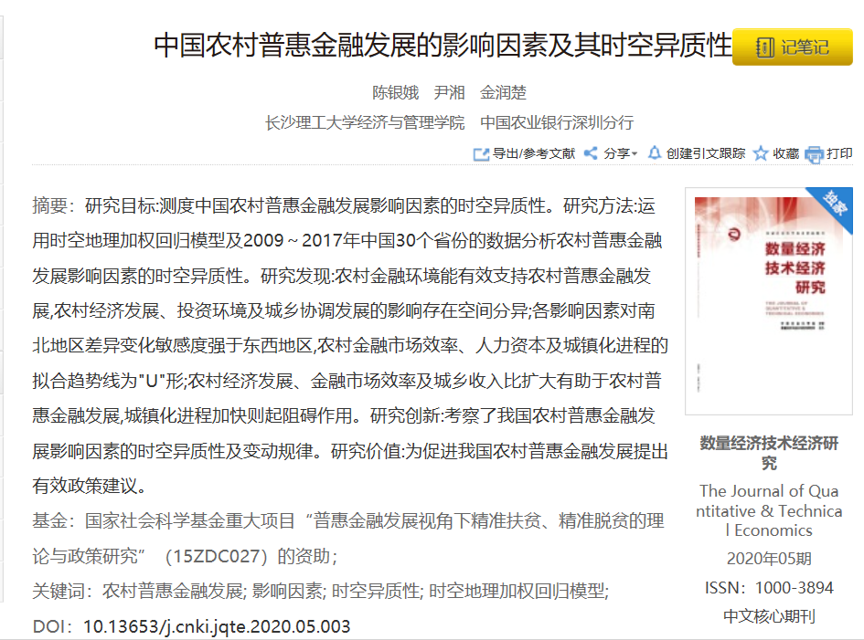 20205月,我校经管学院2018级应用经济学硕士研究生尹湘(第二作者)与导师陈银娥(第一作者)合作的论文《中国农村普惠金融发展的影响因素及其时空异质性》在权威期刊《数量经济技术经济研究》(2020年第5期)发表,是该院提高研究生培养质量的重要成果之一。