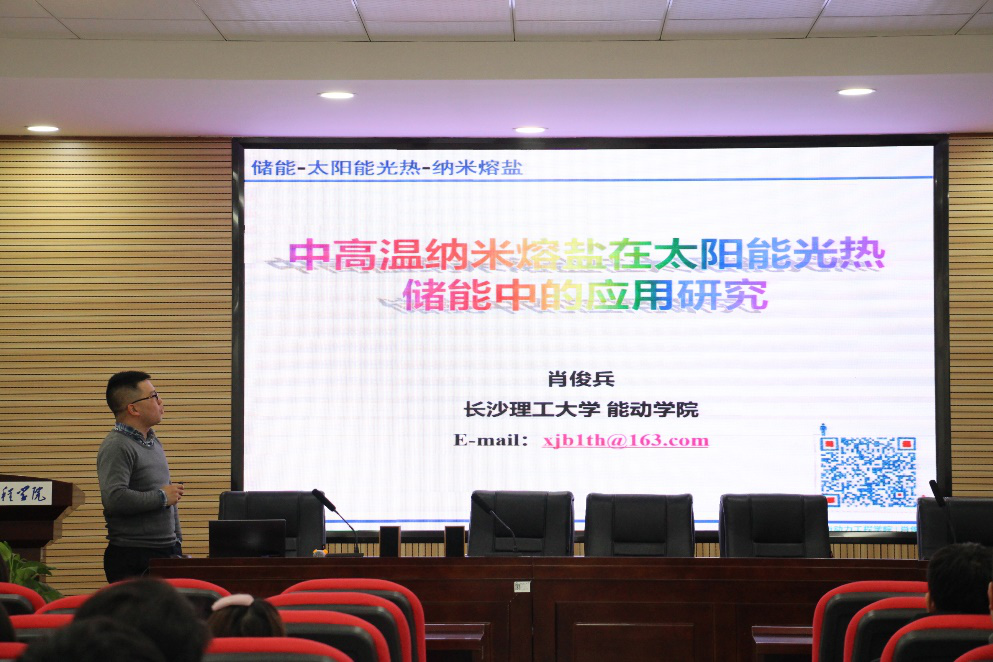 肖俊兵博士带来题为中高温纳米熔盐在太阳能光热储能中的应用研究的报告。从太阳能光热利用的工程实例开始,引出储能是实现太阳能新高质量可控性利用的关键技术,同时也列出储能领域面临的焦点难题。肖博士介绍了纳米熔盐的制备和表征,超声剥离作用的效果等,通过一系列热物理性能研究对比详细阐释了相变储能材料导热系数的增强,并实验测量了相变储能材料的DSC曲线,最后介绍了纳米熔盐太阳炉的设计,以及太阳炉样机的生产和改进过程。