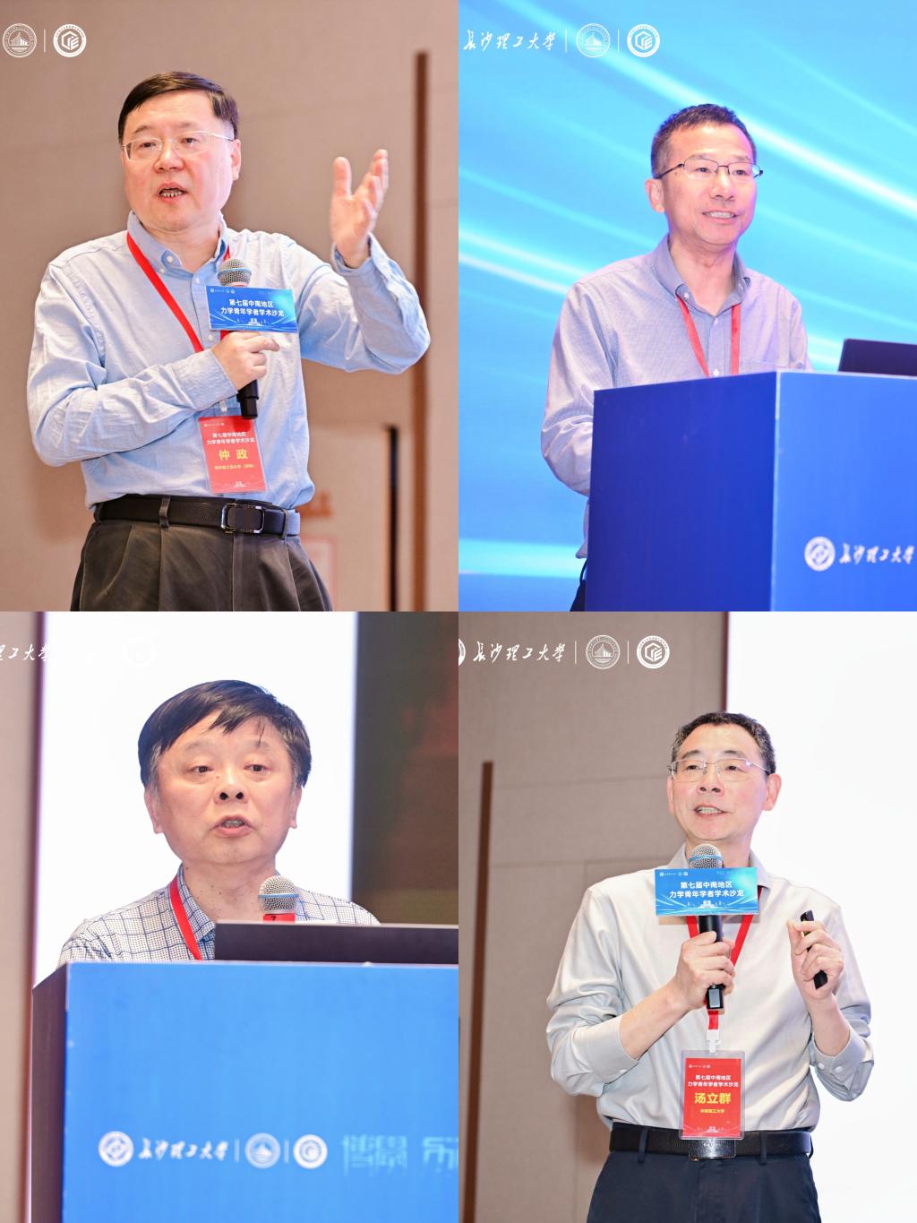 我校湘江卓越工程师学院院长韩艳教授和华中科技大学胡元太教授分别主持大会特邀报告环节。哈尔滨工业大学(深圳)仲政教授、西北工业大学邓子辰教授、浙江大学曲绍兴教授和华南理工大学汤立群教授分别作题为《数据驱动的材料疲劳寿命研究进展》《基于辛算法的空天结构分析与设计》《水凝胶强韧化抗疲劳设计策略:水调控》和《两类可压缩材料的新本构模型》的特邀报告。