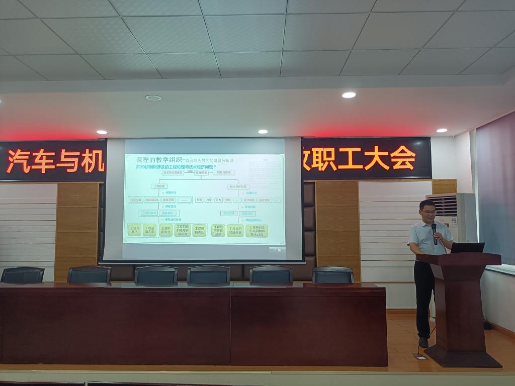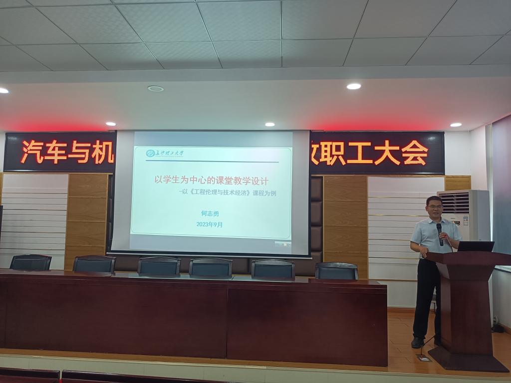 会上,分管教学工作的副院长何志勇以《工程伦理与技术经济”课程》为例,作题为《以学生为中心的课堂教学设计》的专题讲座。讲座内容主要为两部分:以学生为中心的教育教学理念;面向能力目标培养的课程教学设计。报告强调了高等教育及课程教学的目标、基于OBE (Outcome Based Education )的课程设计理念,以及以学生为中心教育的原则,教师的角色及职责转变,学生的角色和学习任务;突出了课程的考试大纲设计的过程化、多样化考核,课程的教学组织,课程目标、学习成果、考核方式、考核成绩之间的关系;报告指明能力培养的关键是提升学业挑战度,而面向能力培养的教学设计,体现在教学方法和考核方式上。
