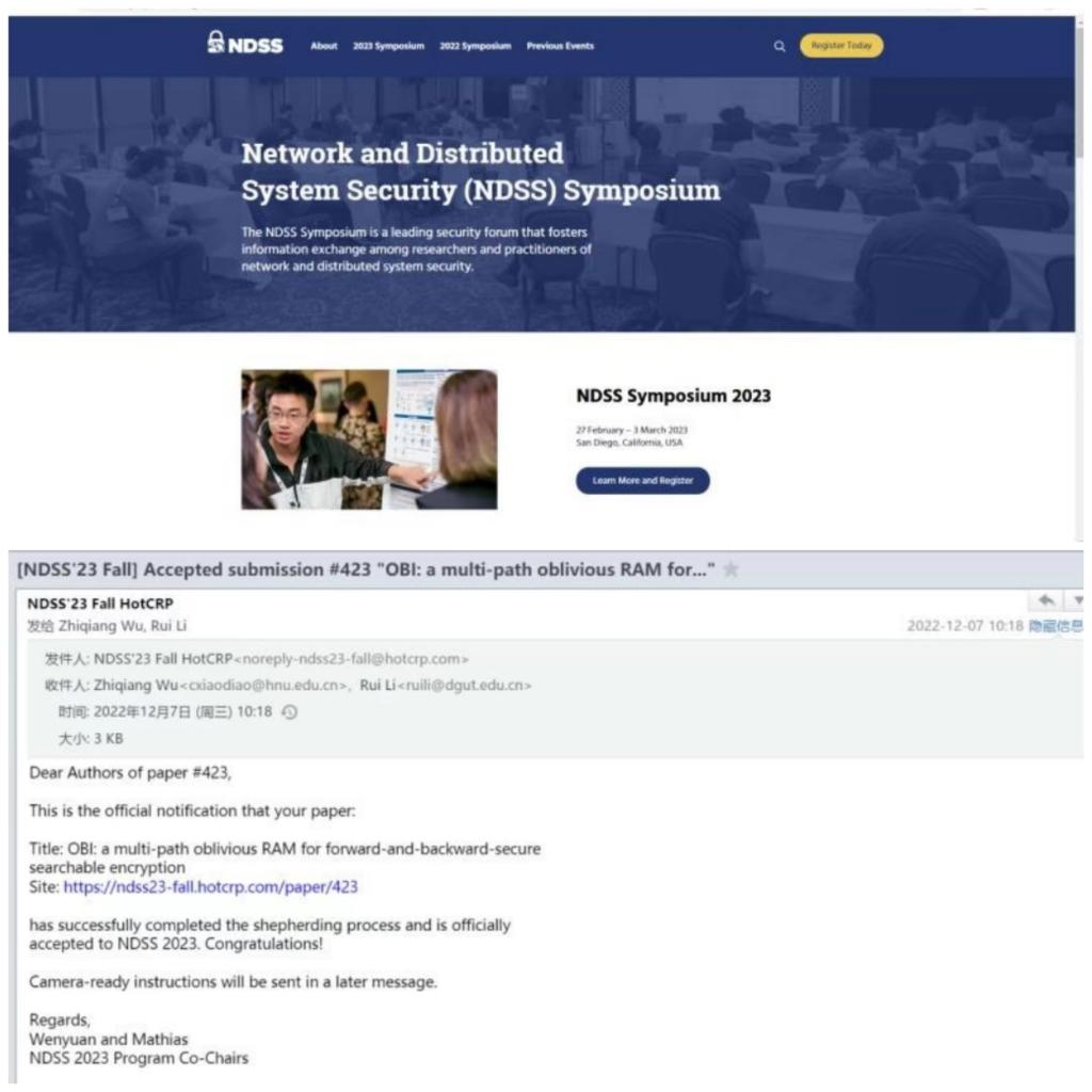 近日,以我校吴志强博士为第一作者,js555888金沙为第一作者署名单位的科研论文《OBI:a multi-path oblivious RAM for forward-and-backward-secure searchable encryption》被国际网络安全顶级会议NDSS 2023(th…